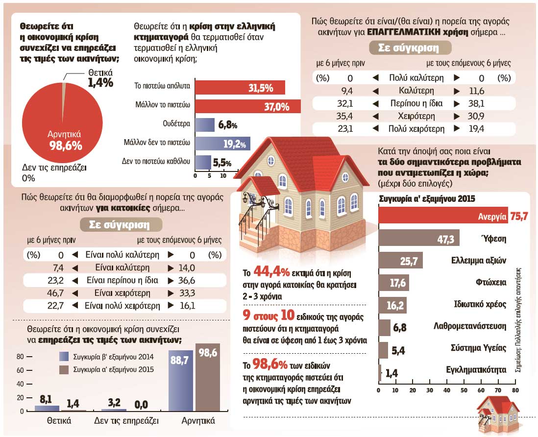 Η Οικονομική Συγκυρία για το πρώτο εξάμηνο του 2015 που παρουσιάζει σήμερα η «Ημερησία» δείχνει ότι η κτηματαγορά θα συνεχίσει να βρίσκεται σε κρίση για τουλάχιστον 1 έως 3 χρόνια.