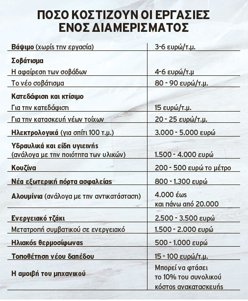 Οι περισσότερες από τις παραπάνω εργασίες αφορούν κυρίως τις μονοκατοικίες. Για ένα απλό διαμέρισμα με οικονομικές επιλογές το κόστος της ανακατασκευής μπορεί να περιοριστεί ακόμη και κάτω από 500 ευρώ/τ.μ.
