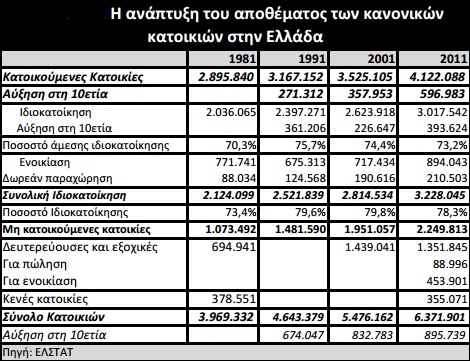 Συνολικά, η αύξηση της ιδιοκατοίκησης στην Ελλάδα στη δεκαετία του 2000 ήταν πολύ μεγαλύτερη από ότι στις δύο προηγούμενες δεκαετίες. Μάλιστα, συνοδεύθηκε με τεράστια αύξηση του αριθμού και του μεγέθους των κατοικιών που χαρακτηρίζονται δευτερεύουσες ή εξοχικές κατοικίες καθώς και των κατοικιών που είναι διαθέσιμες προς πώληση και προς ενοικίαση.